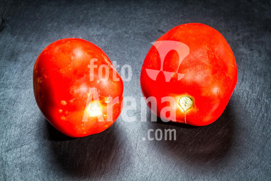 1427615 Tomates maduros (Solanum lycopersicum) sobre tábua de ardósia. Florianópolis, Santa Catarina, Brasil.