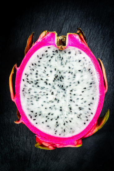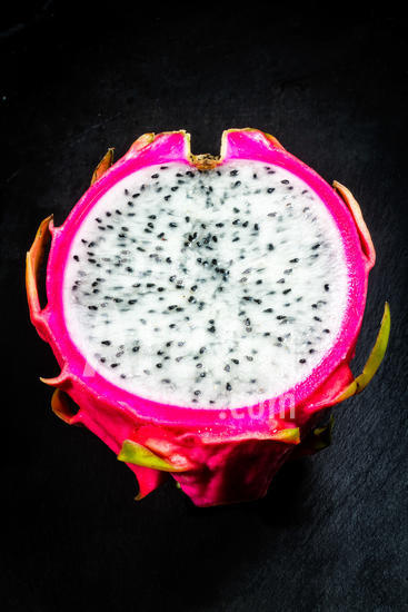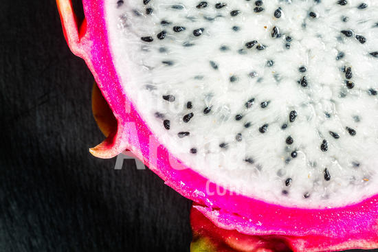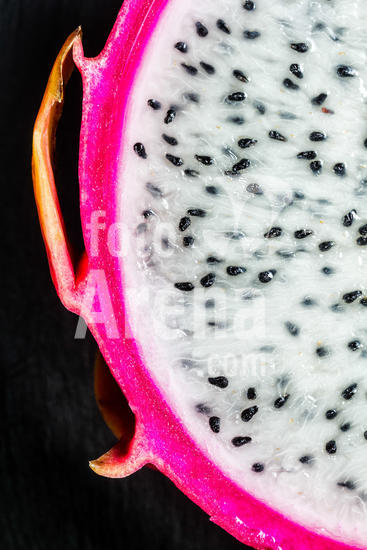 1492835 Detalhe de pitaia branca madura (Hylocereus undatus) cortada ao meio. Florianópolis, Santa Catarina, Brasil.