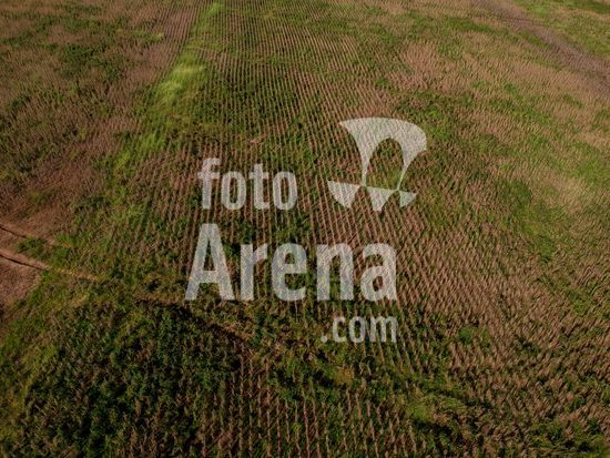 2378691 Vista aérea de uma plantação de soja madura, pronta para a colheita, mas com muitas ervas daninhas de diferentes tipos espalhadas pela lavoura, fato que acarreta em uma grande diminuição da produtividade da leguminosa, na zona rural de Marília, uma cidade de porte médio na região centro-oeste do estado de São Paulo