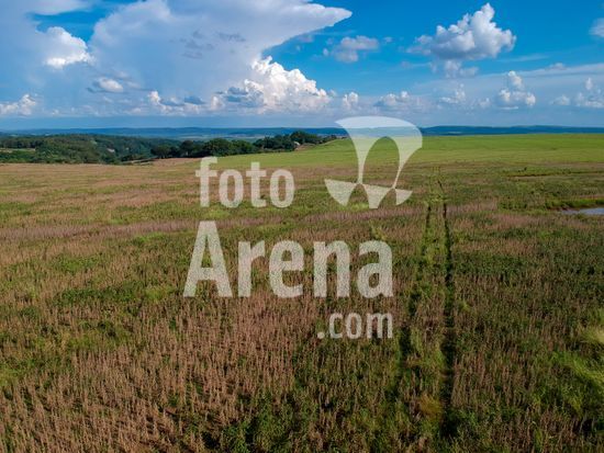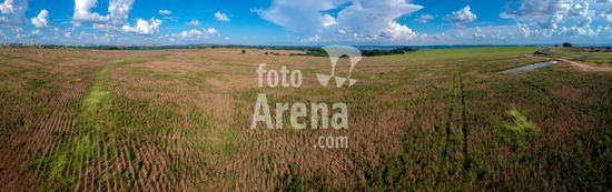 2378704 Vista aérea de uma plantação de soja madura, pronta para a colheita, mas com muitas ervas daninhas de diferentes tipos espalhadas pela lavoura, fato que acarreta em uma grande diminuição da produtividade da leguminosa, na zona rural de Marília, uma cidade de porte médio na região centro-oeste do estado de São Paulo