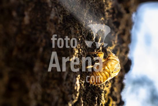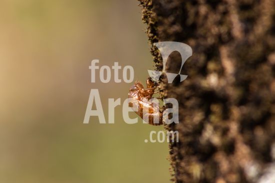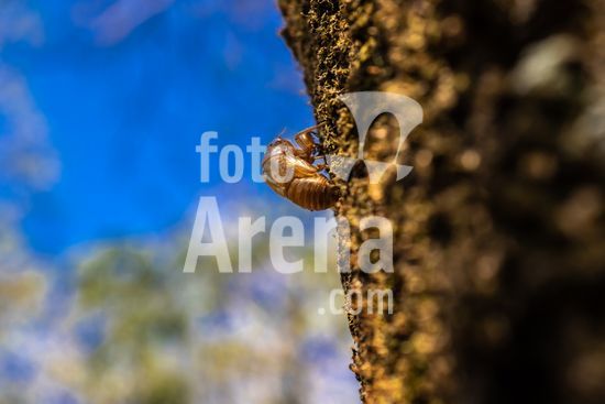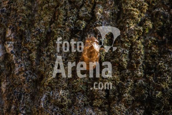 2451853 Exoesqueleto da Cigarra Ninfa (cicada nymph) no tronco de um ipê no interior do Bosque Municipal Rangel Pietraroia em Marilia (SP). As cigarras passam a maior parte de suas vidas no subsolo, só subindo à superfície para acasalar e botar ovos. Eles rastejam do chão como ninfas (mostrado aqui). A parte de trás da ninfa se abre, o antigo exoesqueleto cai e um adulto alado e totalmente maduro emerge.