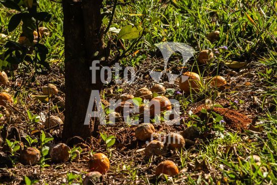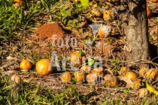 2789813 Laranjas maduras apodrecem sob uma árvore cítrica no pomar de uma fazenda no município de Marília, SP. A cena evoca reflexões sobre o ciclo natural da vida, a abundância da natureza e o processo de decomposição. Ideal para ilustrar temas como agricultura, meio ambiente, sustentabilidade e educação ambiental