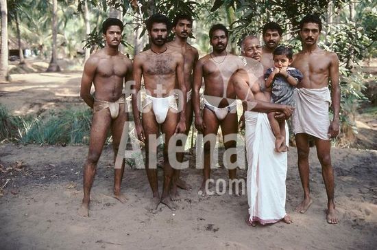 akg1517580 Völkerkunde / Indien / Kalarippayat ( indische Kampfkunst aus Kerala). /-In Chavakkad (Kerala, Süd-Indien): Gruppenbild des Kalarippayat-Lehrers ( Kalari Gurukkal) mit Töchterchen und Schülern.-/ Foto, April 1994.