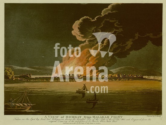 alb4073995 A night scene looking across the water to Bombay on fire; smoke and flames rising from the horizon; hills in the distance; boats in the foreground. A VIEW OF BOMBAY from MALABAR POINT : Taken on the Spot by Lieut Col. Williamson, during the dreadfuol Fire of the Night of the 17th Feby 1803 and Engraved from the original Drawing in the possessiom of Sir Charles Warre Malet Bart. [London] : Published Jany 5 1804 by R. Cribb No288 Holborn London. [January 5 1804]. Aquatint and etching with hand-colouring. Source: Maps K.Top.115.58.e. Language: English. Author: BARTH, J. S.