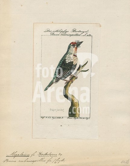 alb4377941 Megalaima rubricapilla, Print, The crimson-fronted barbet or Ceylon small barbet or small barbet (Psilopogon rubricapillus) is an Asian barbet endemic to Sri Lanka. The Malabar barbet endemic to the Western Ghats of India used to be treated as a subspecies of this species. Barbets and toucans are a group of near passerine birds with a worldwide tropical distribution. The barbets get their name from the bristles which fringe their heavy bills., 1772-1829.