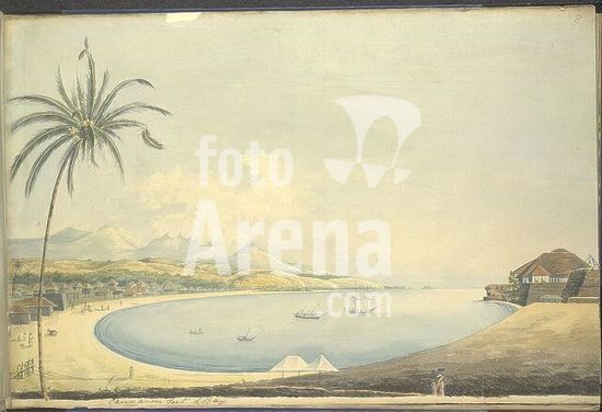 alb4086974 View of Cannanore Bay with a fort on the right, Malabar district. ‘Cannonore fort & Bay’. A sketch-book of 36 drawings depicting scenes chiefly in W. India and Mysore. c. 1795-1801. watercolour. Source: WD 1055, f.8. Language: English. Author: John Johnson.