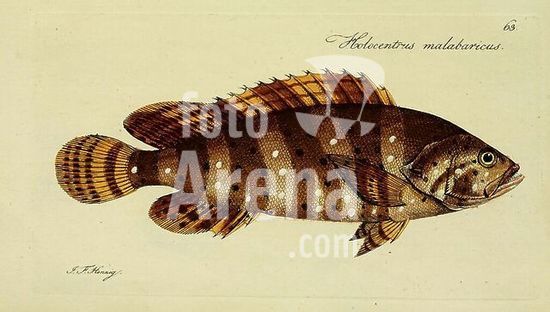 alb15279745 M.E. Blochii Systema ichthyologiae iconibus CX illustratum v.2 Berolini Sumtibus auctoris impressum et Bibliopolio Sanderiano commissum 1801 fish ichthyology fishes grouper Epinephelus malabaricus Malabar grouper Johann Friedrich Hennig Holocentrus malabaricus, The illustration features a detailed depiction of a fish known as Holocentrus malabaricus. The fish is shown with a robust, elongated body adorned with a pattern of dark stripes and lighter spots. Its dorsal fin is broad and majestic, showcasing a series of pointed spines, while the tail fin exhibits a distinct, fan-like shape. The scales are meticulously rendered, giving texture to the surface. The fish's head is illustrated with a slightly open mouth and a prominent eye, adding to its lifelike appearance. The background is minimal, allowing the intricate details of the fish to stand out prominently. An artist's signature, ''S.