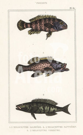 alb18739259 Malabar grouper, Epinephelus malabaricus 1, greasy grouper, Epinephelus tauvina 2, and comber, Serranus cabrilla. L'holocentre salmoide, Holocentrus salmoides, l'holocentre pantherin, Holocentrus pantherinus, l'holocentre verdatre, Serranus cabrilla. Handcoloured stipple engraving by Frédéric Cazenave and others from le Comte de la Cépède's Oeuvres du comte de Lacépède, comprenant l'histoire naturelle des poissons, Paris, circa 1850. The uncredited illustrations were copied from originals by Jacques de Seve, Marcus Bloch, Robert Benard, Jean-Gabriel Pretre, etc.