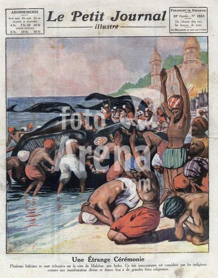908_05_cor9052 Religious ceremony around beached whales, on the coast of Malabar, in India. Frontpage of French newspaper Le petit journal. May 1st, 1921. Private Collection