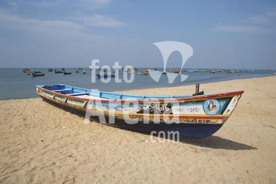 955_14_50116782 Brightly painted, but weathered, fishing boat on the sands of the Malabar Coast on the Arabian Sea. Many more boats are moored in the sea behind.