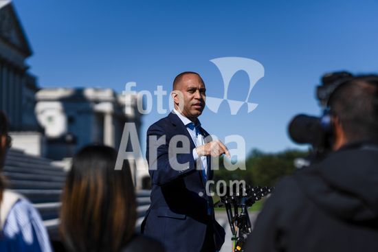 ny211025114211 House Minority Leader Hakeem Jeffries (D-N.Y.) speaks about the shutdown impasse on the steps of the Capitol in Washington, on Wednesday, Oct. 16, 2025. An upstate New York man pardoned by President Donald Trump after taking part in the attack on the Capitol on Jan. 6, 2021 has been charged with threatening to assassinate Jeffries. (Tierney L. Cross/The New York Times/Fotoarena)