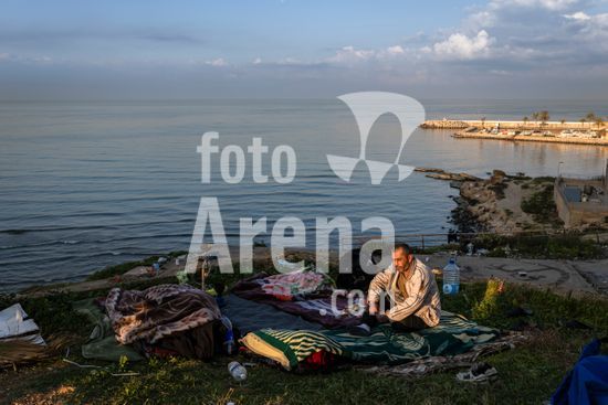 ny070326104215 A man camps out with his brother and son along the Corniche, the famed seaside promenade in Beirut now filling up with displaced Lebanese families, on Saturday, March 7, 2026. Overnight, Israeli warplanes repeatedly bombarded the southern outskirts of Beirut, where the IDF had ordered hundreds of thousands of residents to flee; More than 200 people in Lebanon have been killed, according to the national health ministry. (Diego Ibarra Sanchez/The New York Times/Fotoarena)
