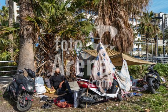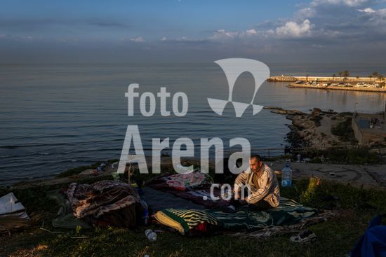 ny220326133613 A displaced man sits next to his tent on the seaside corniche in Beirut, March 6, 2026. He and his family fled the southern suburbs of Beirut in early March. (Diego Ibarra Sanchez/The New York Times/Fotoarena)
