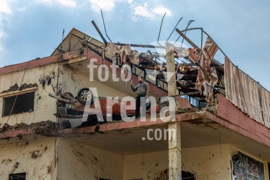 ny070326120412 A man takes photos from the third-story patio of a building, next to a car which had been propelled up there by an Israeli airstrike that left a massive crater below, in the village of Nabi Chit, Lebanon on Saturday, March 7, 2026. Overnight, Israeli warplanes repeatedly bombarded the southern outskirts of Beirut, where the IDF had ordered hundreds of thousands of residents to flee; More than 200 people in Lebanon have been killed, according to the national health ministry. (David Guttenfelder/The New York Times/Fotoarena)