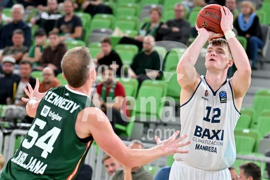 2816480 Ljubljana, Eslovênia, 1º de outubro de 2025, Louis Olinde do BAXI Manresa (L) em ação durante a partida de basquete BKT EuroCup entre Cedevita Olimpija (Eslovênia) e BAXI Manresa (Espanha) na Arena Stozice, Ljubljana, Eslovênia. (Foto de Igor Kupljenik/Sports Press Photo)