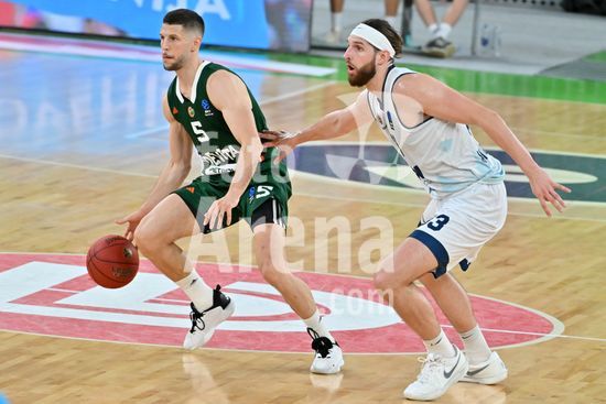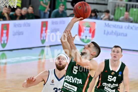 2816481 Ljubljana, Eslovênia, 1º de outubro de 2025, Marcis Steinbergs do BAXI Manresa (R) em ação contra Thomas Kennedy do Cedevita Olimpija (L) durante a partida de basquete BKT EuroCup entre Cedevita Olimpija (Eslovênia) e BAXI Manresa (Espanha) na Arena Stozice, Ljubljana, Eslovênia. (Foto de Igor Kupljenik/Sports Press Photo)
