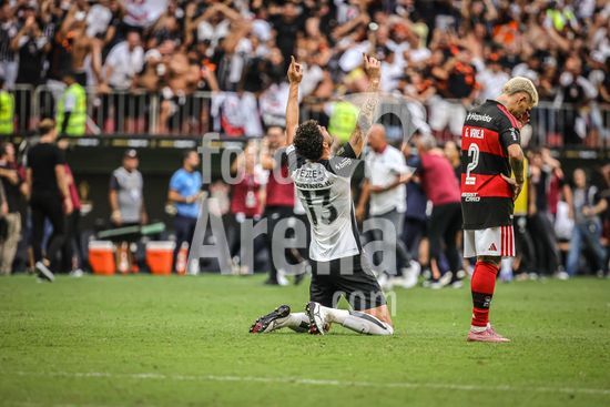 2878427 Jogador Gustavo se ajoelha após o termino do jogo e faz seu agradecimento pela vitória e ao lado está o jogador Arrascaeta desolado pela derrota do Jogo da Supercopa Rei, realizado no Mané Garrincha, em Brasiia, na data de hoje
