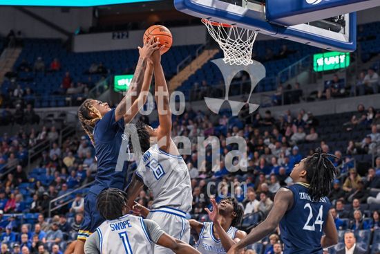 58024320 NOVEMBER 25, 2024: Saint Louis Billikens forward Kalu Anya (6) reaches above Quinnipiac Bobcats guard Jaden Zimmerman (24) to grab the rebound in a regular season game where the Quinnipiac Bobcats visited the Saint Louis Billikens. Held at Chaifetz Arena in St. Louis, MO on Monday November 25, 2024 Richard Ulreich/CSM/Sipa USA (Credit Image: © Richard Ulreich/Cal Sport Media/Sipa USA) (Credit Image: © Richard Ulreich/Cal Sport Media/Sipa USA)