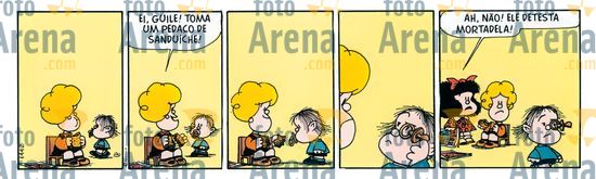 col1442pt TIRA MAFALDA, CÓDIGO ORIGINAL 1442, PORTUGUES, EDIÇÕES MARTINS FONTES.DiálogoSusanita: Ei, Guile! Tomá um pedaço de sanduíche!Mafalda: Ah, não! Ele detesta mortadela!As tiras da Mafalda, coloridas em português (com gramática atualizada), foram cedidas pela © Martins Editora Livraria Ltda. para licenciamento através da Fotoarena. Foram colorizadas pela editora Glénat.
