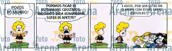 col1450pt TIRA MAFALDA, CÓDIGO ORIGINAL 1450, PORTUGUES, EDIÇÕES MARTINS FONTES.DiálogoSusanita: Povos do mundo! Podemos ficar de estômagos cruzados, enquanto meia humanidade sobre de apetite? E vocês, por que estão me olhando com essas caras rídiculas?As tiras da Mafalda, coloridas em português (com gramática atualizada), foram cedidas pela © Martins Editora Livraria Ltda. para licenciamento através da Fotoarena. Foram colorizadas pela editora Glénat.