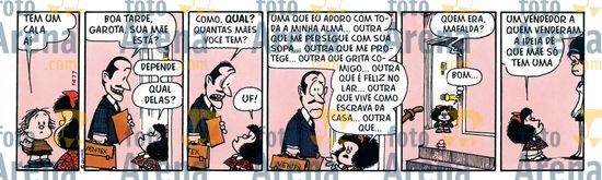 col1477pt TIRA MAFALDA, CÓDIGO ORIGINAL 1477, PORTUGUES, EDIÇÕES MARTINS FONTES.DiálogoGuile: Tem um cala aí.Homem: Boa tarde, garota. Sua mãe está?Mafalda: Depende. Qual delas?Homem: Como, qual? Quantas mães você tem?Mafalda: Uh! Uma que eu adoro com toda a minha alma... Outra que me persegue com sua sopa... Outra que me protege... Outra que grita comigo... Outra que é feliz no lar... Outra que vive como escrava da casa... Outra que...Mamãe: Quem era, Mafalda?Mafalda: Bom... Um vendedor a quem venderam a ideia de que mãe só tem uma.As tiras da Mafalda, coloridas em português (com gramática atualizada), foram cedidas pela © Martins Editora Livraria Ltda. para licenciamento através da Fotoarena. Foram colorizadas pela editora Glénat.