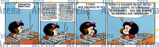 col1478pt TIRA MAFALDA, CÓDIGO ORIGINAL 1478, PORTUGUES, EDIÇÕES MARTINS FONTES.DiálogoMafalda: Coluna social. É como nos seriados de TV. Quem é o viajante um dia, no outro é o doente, ou padrinho de casamento... Mas são sempre os mesmos que trabalham!As tiras da Mafalda, coloridas em português (com gramática atualizada), foram cedidas pela © Martins Editora Livraria Ltda. para licenciamento através da Fotoarena. Foram colorizadas pela editora Glénat.