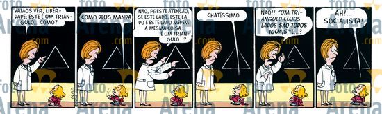col1483pt TIRA MAFALDA, CÓDIGO ORIGINAL 1483, PORTUGUES, EDIÇÕES MARTINS FONTES.DiálogoProfessora: Vamos ver, Liberdade, este é um triângulo... Como?Liberdade: Como deus manda.Professora: Não, preste atenção, se este lado, este lado e ste lado medem a mesma coisa é um triângulo...?Liberdade: Chatíssimo!Professora: Não!! "Um triângulo cujos lados são todos iguais."Liberdade: Ah! Socialista!As tiras da Mafalda, coloridas em português (com gramática atualizada), foram cedidas pela © Martins Editora Livraria Ltda. para licenciamento através da Fotoarena. Foram colorizadas pela editora Glénat.