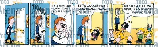 col1493pt TIRA MAFALDA, CÓDIGO ORIGINAL 1493, PORTUGUES, EDIÇÕES MARTINS FONTES.DiálogoPapai: O que aconteceu? quem fechou a porta a chave? Estão loucos? Por que se trancaram desse jeito?Mafalda: Questão de ética, mas entre, já acabamos de falar dos pais.As tiras da Mafalda, coloridas em português (com gramática atualizada), foram cedidas pela © Martins Editora Livraria Ltda. para licenciamento através da Fotoarena. Foram colorizadas pela editora Glénat.