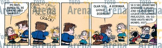col1496pt TIRA MAFALDA, CÓDIGO ORIGINAL 1496, PORTUGUES, EDIÇÕES MARTINS FONTES.DiálogoGuile: Po favô, Manolito, dá coda no meu ônibus?Manolito: Olha só! A rodinha, Guile! A rodinha! Se o seu irmão não aprender a valorizar os pequenos lucros dos grandes prejuízos, vai sofrer muito neste mundo, viu?As tiras da Mafalda, coloridas em português (com gramática atualizada), foram cedidas pela © Martins Editora Livraria Ltda. para licenciamento através da Fotoarena. Foram colorizadas pela editora Glénat.