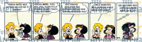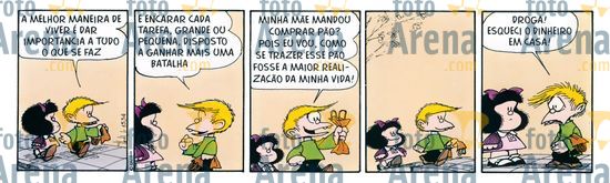 col1534pt TIRA MAFALDA, CÓDIGO ORIGINAL 1534, PORTUGUES, EDIÇÕES MARTINS FONTES.DiálogoFilipe: A melhor maneira de vivier é dar importância a tudo o que se faz e encarar cada tarefa, grande ou pequena, disposto a ganhar mais uma batalha. Minha mãe mandou comprar pão? Pois eu vou, como se trazer esse pão fosse a maior realização da minha vida! Droga! Esqueci o dinheiro em casa!As tiras da Mafalda, coloridas em português (com gramática atualizada), foram cedidas pela © Martins Editora Livraria Ltda. para licenciamento através da Fotoarena. Foram colorizadas pela editora Glénat.