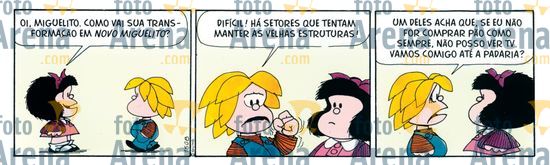 col1508pt TIRA MAFALDA, CÓDIGO ORIGINAL 1508, PORTUGUES, EDIÇÕES MARTINS FONTES.DiálogoMafalda: Oi, Miguelito. Como vai sua transformação em novo Miguelito?Miguelito: Difícil! Há setores que tentam manter as velhas estruturas! Um deles acha que se eu não for comprar pão como sempre, não posso ver TV. Vamos comigo até a padaria?As tiras da Mafalda, coloridas em português (com gramática atualizada), foram cedidas pela © Martins Editora Livraria Ltda. para licenciamento através da Fotoarena. Foram colorizadas pela editora Glénat.