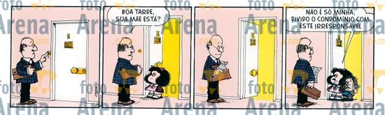 col1529pt TIRA MAFALDA, CÓDIGO ORIGINAL 1529, PORTUGUES, EDIÇÕES MARTINS FONTES.DiálogoHomem: Boa tarde, sua mãe está?Mafalda: Não é só minha; divido o condomínio com este irresponsável.As tiras da Mafalda, coloridas em português (com gramática atualizada), foram cedidas pela © Martins Editora Livraria Ltda. para licenciamento através da Fotoarena. Foram colorizadas pela editora Glénat.