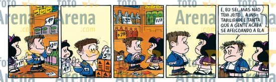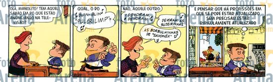 col1786pt TIRA MAFALDA, CÓDIGO ORIGINAL 1786, PORTUGUES, EDIÇÕES MARTINS FONTES.DiálogoMulher: Olá, Manolito! Tem aquele sabão em pó que estão anunciando na televisão?Manolito: Qual, o do blin-blin, "pulcrilimp".Mulher: Não, aquele outro: devoram, devoram. Devoram as sujeirinhas. As borbulhinhas de "savonex".Manolito: E pensar que há profissões em que se pode estar atualizado sem precisar estar ridiculamente atualizado.As tiras da Mafalda, coloridas em português (com gramática atualizada), foram cedidas pela © Martins Editora Livraria Ltda. para licenciamento através da Fotoarena. Foram colorizadas pela editora Glénat.
