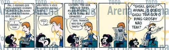 col1554pt TIRA MAFALDA, CÓDIGO ORIGINAL 1554, PORTUGUES, EDIÇÕES MARTINS FONTES.DiálogoMafalda: Pai, é verdade que antigamente quando os adultos falavam, as crianças tinham que calar o bico?Papai: É verdade, sim.Mafalda: Meu deus! E você aguentou aquele tempo horrível?Papai: Pois é.Mafalda: Coitado, ter que engolir todas as respostas, calar todas as opiniões!Papai: Ora, também não era tanto! "Gigli, Gigli! Afinal o que o Gigli tem que o Bing Crosby não tem?As tiras da Mafalda, coloridas em português (com gramática atualizada), foram cedidas pela © Martins Editora Livraria Ltda. para licenciamento através da Fotoarena. Foram colorizadas pela editora Glénat.