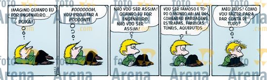 col1572pt TIRA MAFALDA, CÓDIGO ORIGINAL 1572, PORTUGUES, EDIÇÕES MARTINS FONTES.DiálogoFilipe: Imagino quando eu for engenheiro... Puxa! Booooom, vou projetar a poooonte. Não vou ser assim! Quando eu for engenheiro, não vou ser assim! Vou ser famoso e todo mundo vai me encomendar barragens, estradas, fábricas, túneis, aquedutos e... Meu deus! Como vou fazer para dar conta de tudo?As tiras da Mafalda, coloridas em português (com gramática atualizada), foram cedidas pela © Martins Editora Livraria Ltda. para licenciamento através da Fotoarena. Foram colorizadas pela editora Glénat.