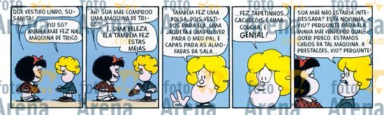 col1575pt TIRA MAFALDA, CÓDIGO ORIGINAL 1575, PORTUGUES, EDIÇÕES MARTINS FONTES.DiálogoMafalda: Que vestido lindo, Susanita!Susanita: Viu só? Minha mãe fez na máquina de tricô.Mafalda: Ah! sua mãe comprou uma máquina de tricô?Susanita: É, uma beleza. ela também fez estas meias. Também fez uma bolsa, dois vestidos para ela, uma jaqueta de pulôver para o meu pai, e capas para as almofadas da sala... fez tapetinhos e cachecóis e uma colcha, é genial! Sua mãe não estaria interessada? Está novinha, viu? Pergunte para ela. Minha mãe vende por qualquer preço. Estamos cheios da tal máquina. A prestações, viu? Pergunte!As tiras da Mafalda, coloridas em português (com gramática atualizada), foram cedidas pela © Martins Editora Livraria Ltda. para licenciamento através da Fotoarena. Foram colorizadas pela editora Glénat.