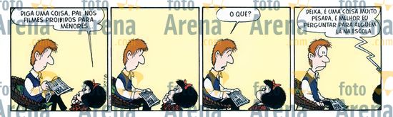 col1578pt TIRA MAFALDA, CÓDIGO ORIGINAL 1578, PORTUGUES, EDIÇÕES MARTINS FONTES.DiálogoMafalda: Diga uma coisa, pai: nos filmes proibidos para menores...Pai: O quê?Mafalda: Deixa, é uma coisa muito pesada, é melhor eu perguntar para alguém lá na escola.As tiras da Mafalda, coloridas em português (com gramática atualizada), foram cedidas pela © Martins Editora Livraria Ltda. para licenciamento através da Fotoarena. Foram colorizadas pela editora Glénat.