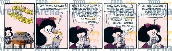 col1586pt TIRA MAFALDA, CÓDIGO ORIGINAL 1586, PORTUGUES, EDIÇÕES MARTINS FONTES.DiálogoTelefone: "Alô, estou falando com o número errado?Mafalda: Não sei, com quem o senhor quer falar?Telefone: Não.. Para quê? O coração me diz: é o número errado.Mafalda: Bom, mas com que nú...Telefone: Não vale a pena, é sempre assim... Errado... Eternamente... Errado.. Adeus... Sempre errado... Sempre.. Adeus...Mafalda: Coitado, com que romantismo ele suporta os serviços públicos.As tiras da Mafalda, coloridas em português (com gramática atualizada), foram cedidas pela © Martins Editora Livraria Ltda. para licenciamento através da Fotoarena. Foram colorizadas pela editora Glénat.