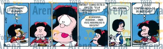 col1609pt TIRA MAFALDA, CÓDIGO ORIGINAL 1609, PORTUGUES, EDIÇÕES MARTINS FONTES.DiálogoMafalda: Uhmmm! Vejamos!Mamãe: Então? Como está o pastél "à la mélangeuse".Mafalda: Bommmm. Bommm. Onde você arranjou a receita?Mamãe: No jornal.Mafalda: É isso! Contaminou-se de notícias!As tiras da Mafalda, coloridas em português (com gramática atualizada), foram cedidas pela © Martins Editora Livraria Ltda. para licenciamento através da Fotoarena. Foram colorizadas pela editora Glénat.