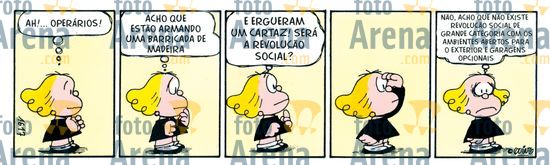 col1617pt TIRA MAFALDA, CÓDIGO ORIGINAL 1617, PORTUGUES, EDIÇÕES MARTINS FONTES.DiálogoLiberdade: Ah! Operários! Acho que estão armando uma barricada de madeira e ergueram um cartaz! Será a revolução social? Não, acho que não existe revolução social de grande categoria com os ambientes abertos para o exterior e garagens opcionais.As tiras da Mafalda, coloridas em português (com gramática atualizada), foram cedidas pela © Martins Editora Livraria Ltda. para licenciamento através da Fotoarena. Foram colorizadas pela editora Glénat.