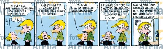col1620pt TIRA MAFALDA, CÓDIGO ORIGINAL 1620, PORTUGUES, EDIÇÕES MARTINS FONTES.DiálogoLiberdade: Vi que a sua mãe compra no mesmo açougue que a minha Filipe.Filipe: Ah, é?Liberdade: A gente deve ter comido bifes da mesma vaca várias vezes. Veja só, companheiros de vaca sem saber! E pensar que todo dia, toda semana, todo mês mastigamos uma vaca em grupo!Filipe: Mãe, se não tiver abóbora cozida ou coisa parecida, não contem comigo na mesa!As tiras da Mafalda, coloridas em português (com gramática atualizada), foram cedidas pela © Martins Editora Livraria Ltda. para licenciamento através da Fotoarena. Foram colorizadas pela editora Glénat.