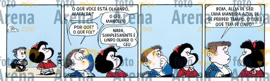 col1635pt TIRA MAFALDA, CÓDIGO ORIGINAL 1635, PORTUGUES, EDIÇÕES MARTINS FONTES.DiálogoManolito: O que você está olhando, Mafalda?Mafalda: O céu, Manolito.Manolito: Por quê? O que foi?Mafalda: Nada, simplesmente é lindo olhar o céu.Manolito: Bom, além de ser uma maneira azul de se perder tempo, o que é que tem de lindo?As tiras da Mafalda, coloridas em português (com gramática atualizada), foram cedidas pela © Martins Editora Livraria Ltda. para licenciamento através da Fotoarena. Foram colorizadas pela editora Glénat.