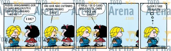 col1681pt TIRA MAFALDA, CÓDIGO ORIGINAL 1681, PORTUGUES, EDIÇÕES MARTINS FONTES.DiálogoMiguelito: Fiquei imaginando que o chão não existe e que estou parado no ar.Mafalda: E daí?Miguelito: Daí que não entndo como eu não caio!Mafalda: É fácil! Se o chão não existe, onde você vai cair?Miguelito: O que é ser realista!As tiras da Mafalda, coloridas em português (com gramática atualizada), foram cedidas pela © Martins Editora Livraria Ltda. para licenciamento através da Fotoarena. Foram colorizadas pela editora Glénat.