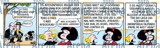 col1682pt TIRA MAFALDA, CÓDIGO ORIGINAL 1682, PORTUGUES, EDIÇÕES MARTINS FONTES.DiálogoHomem 1: ...E tudo para receber uma miserável aposentadoria!Homem 2: Pois é!Liberdade: Os aposentados deviam era fazer uma boa greve! Greve geral dos aposentados por tempo indeterminado em todo o país, e não afrouxar!Mafalda: Não ia acontecer nada, Liberdade!Liberdade: Como não? Há! O governo ia ter que chamar o exército para cobrir a falta de aposentados, e os soldados iam ter que ler o jornal nas praças, atravessar mal as ruas, protestar contra os jovens! E os avós? Quem seriam os avós? Você acha que alguém ia aguentar ter em casa um soldado de infantaria fazendo papel de avô? Hein?As tiras da Mafalda, coloridas em português (com gramática atualizada), foram cedidas pela © Martins Editora Livraria Ltda. para licenciamento através da Fotoarena. Foram colorizadas pela editora Glénat.