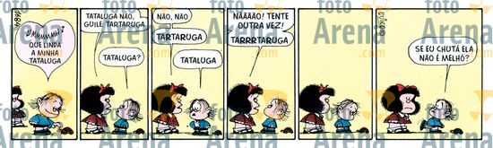 col1684pt TIRA MAFALDA, CÓDIGO ORIGINAL 1684, PORTUGUES, EDIÇÕES MARTINS FONTES.DiálogoGuile: Que linda a minha tataluga.Mafalda: Tataluga não, Guile: Tartaruga.Guile: Tataluga?Mafalda: Não, não. Tartaruga.Guile: Tataluga.Mafalda: Nããão! Tente outra vez! Tarrrtaruga.Guile: Se eu chutá ela não é melhó?As tiras da Mafalda, coloridas em português (com gramática atualizada), foram cedidas pela © Martins Editora Livraria Ltda. para licenciamento através da Fotoarena. Foram colorizadas pela editora Glénat.