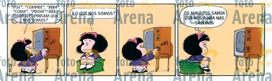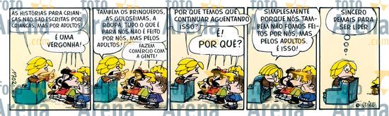 col1702pt TIRA MAFALDA, CÓDIGO ORIGINAL 1702, PORTUGUES, EDIÇÕES MARTINS FONTES.DiálogoMiguelito: As histórias para crianças não são escritas por crianças, mas por adultos!Mafalda, Filipe, Susanita e Manolito: é uma vergonha!Manolito: Também os brinquedos, as guloseimas, a roupa, tudo o que é para nós não é feito por nós, mas pelos adultos!Mafalda, Filipe, Susanita e Manolito: Fazem comércio com a gente!Miguelito: Por que temos que continuar aguentando isso?Mafalda, Filipe, Susanita e Manolito: É! Por quê?Miguelito: Simplesmente porque nós também não fomos feitos por nós, mas pelos adultos. É isso. Sincero demais para ser líder.As tiras da Mafalda, coloridas em português (com gramática atualizada), foram cedidas pela © Martins Editora Livraria Ltda. para licenciamento através da Fotoarena. Foram colorizadas pela editora Glénat.