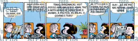 col1704pt TIRA MAFALDA, CÓDIGO ORIGINAL 1704, PORTUGUES, EDIÇÕES MARTINS FONTES.DiálogoGuile: Calamba, que coisa!Mafalda: Para quem você quer fingir que sabe ler, Guile?Guile: Tenho imaginação, viu? Posso imaginá que o jonal taz a notícia que eu quelo sobe o mundo, a política, as balas, o goveno e tudo!Mafalda: Ah, é? e o que o jornal diz hoje do presidente, por exemplo?Guile: Ola! Ele me põe nas nuvens, como sempe.As tiras da Mafalda, coloridas em português (com gramática atualizada), foram cedidas pela © Martins Editora Livraria Ltda. para licenciamento através da Fotoarena. Foram colorizadas pela editora Glénat.