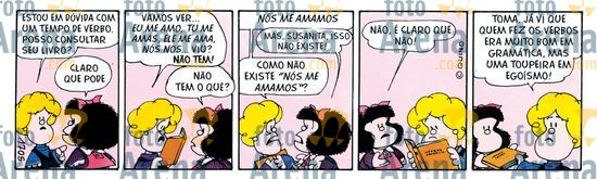 col1705pt TIRA MAFALDA, CÓDIGO ORIGINAL 1705, PORTUGUES, EDIÇÕES MARTINS FONTES.DiálogoSusanita: Estou em dúvida com um tempo de verbo. Posso consultar seu livro?Mafalda: Claro que pode.Susanita: Vamos ver... "Eu me amo, tu me amas, ele me ama, nós nos..." Viu? Não tem!Mafalda: Não tem o quê?Susanita: Nós me amamos.Mafalda: Mas, Susanita, isso não existe!Susanita: Como não existe "nós me amamos"?Mafalda: Não, é claro que não!Susanita: Toma. Já vi que quem fez os verbos era muito bom em gramática, mas uma toupeira em egoísmo!As tiras da Mafalda, coloridas em português (com gramática atualizada), foram cedidas pela © Martins Editora Livraria Ltda. para licenciamento através da Fotoarena. Foram colorizadas pela editora Glénat.