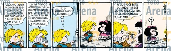 col1709pt TIRA MAFALDA, CÓDIGO ORIGINAL 1709, PORTUGUES, EDIÇÕES MARTINS FONTES.DiálogoMiguelito: Um sabotador acende esse fósforo e explode um gasoduto. Um cozinheiro acede e faz um risoto. Um distraído o acende e incendeia um parque nacional. Um operário o acende e põe em funcionamento um complexo siderúrgico. Eu o acendo e o que acontece? O que você está olhando? Nesse mundo cada um tem sua idiossincrasia! Não é?As tiras da Mafalda, coloridas em português (com gramática atualizada), foram cedidas pela © Martins Editora Livraria Ltda. para licenciamento através da Fotoarena. Foram colorizadas pela editora Glénat.