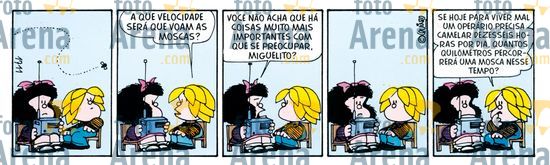 col1711pt TIRA MAFALDA, CÓDIGO ORIGINAL 1711, PORTUGUES, EDIÇÕES MARTINS FONTES.DiálogoMiguelito: A que velocidade será que voam as moscas?Mafalda: Você não acha que há coisas muito mais importantes com que se preocupar, Miguelito?Miguelito: Se hoje para viver mal um operário precisa camelar dezesseis horas por dia. Quantos quilômetros percorrerá uma mosca nesse tempo?As tiras da Mafalda, coloridas em português (com gramática atualizada), foram cedidas pela © Martins Editora Livraria Ltda. para licenciamento através da Fotoarena. Foram colorizadas pela editora Glénat.
